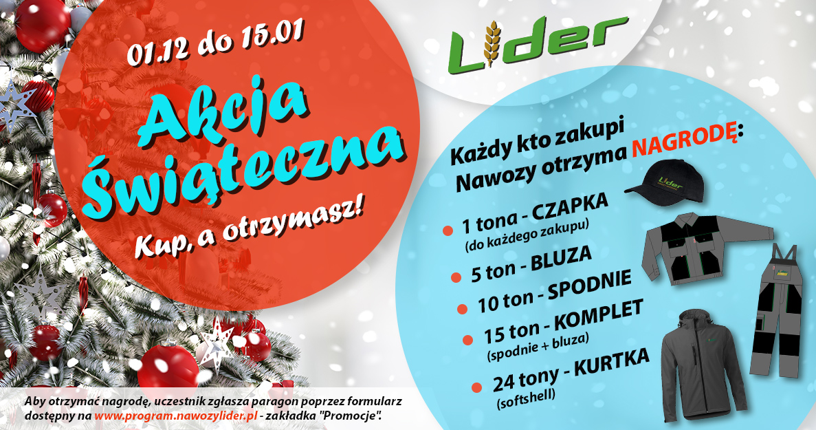 Nawozy Lider zapraszają do udziału w Akcji Świątecznej – kup a otrzymasz prezent. Każdy kto zakupi Nawozy otrzyma niezwykłą zimową nagrodę. Dostępne nagrody: Czapka,... Czytaj dalej